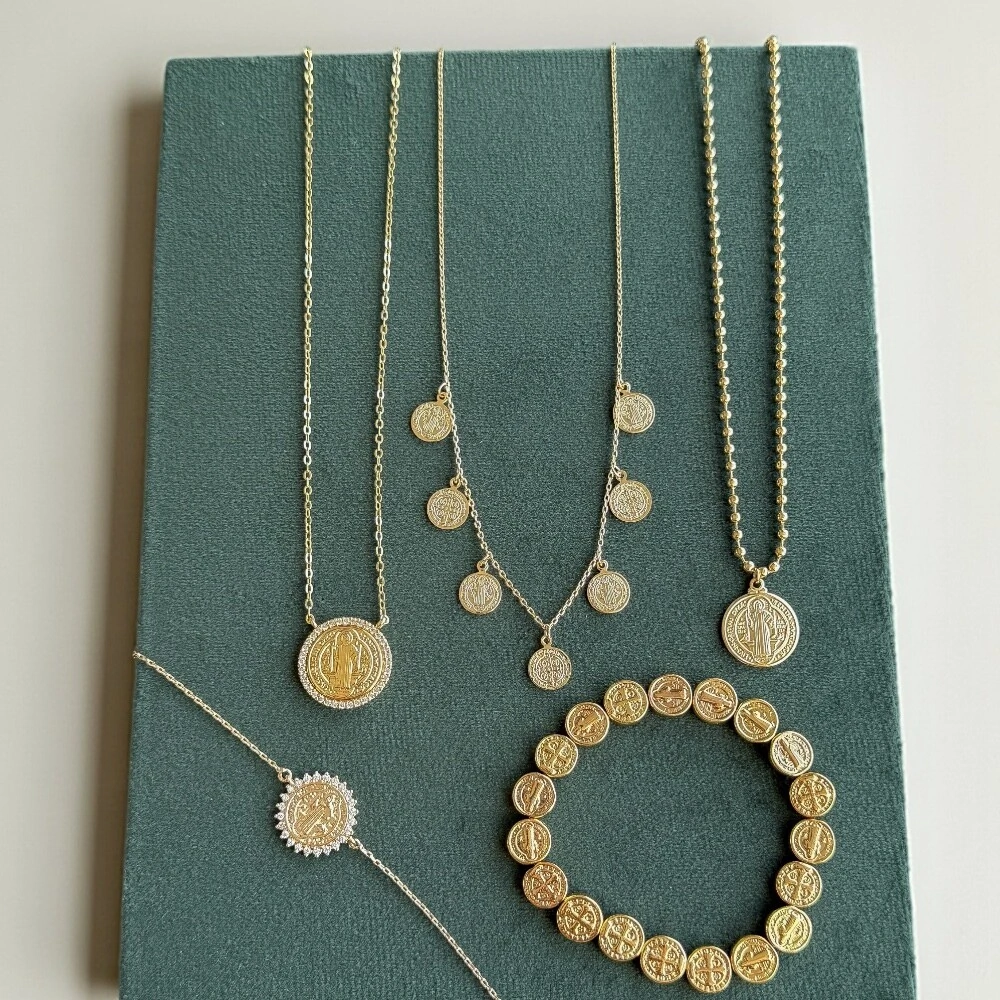 A medalha de São Bento, reconhecida por seu simbolismo de proteção e bênçãos, está delicadamente pendurada, tornando este colar não apenas um acessório, mas também um amuleto de força e fé. Banhado em Ouro 18k, o colar garante um brilho duradouro e uma aparência luxuosa, adicionando um toque de requinte ao seu visual.