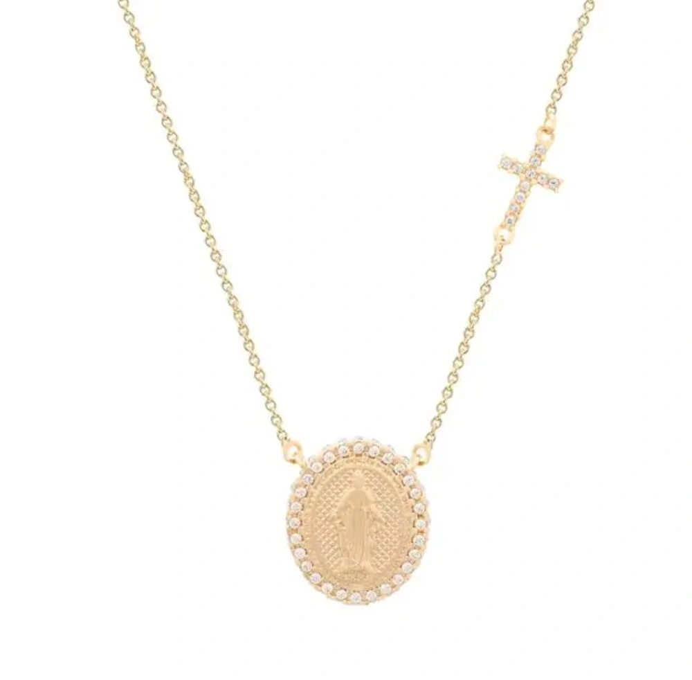 Elegante e cheio de significado, este colar joia une a medalha de Nossa Senhora das Gracas ao crucifixo em um design delicado e atemporal. Uma peça pensada para mulheres que desejam carregar fe, protecao e sofisticação no dia a dia.